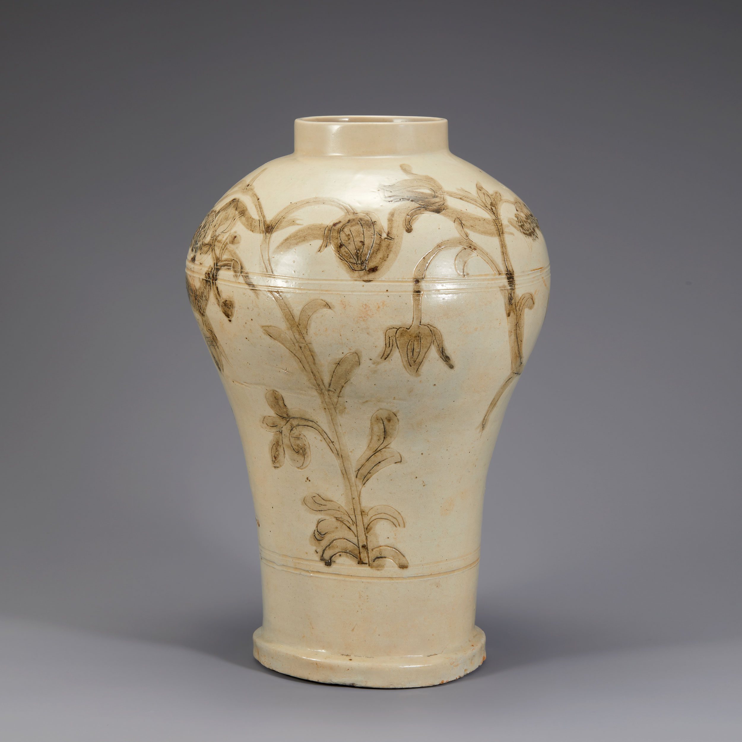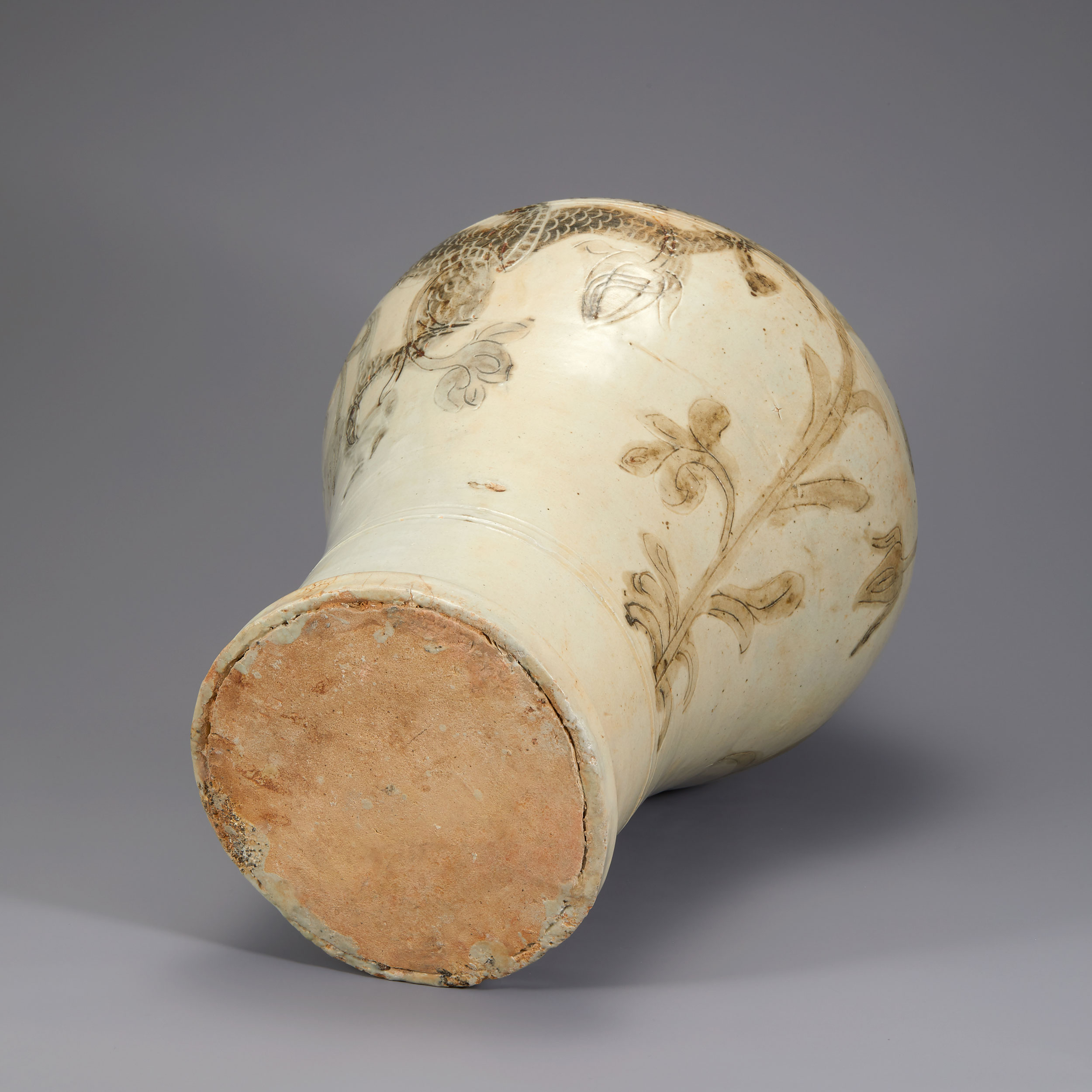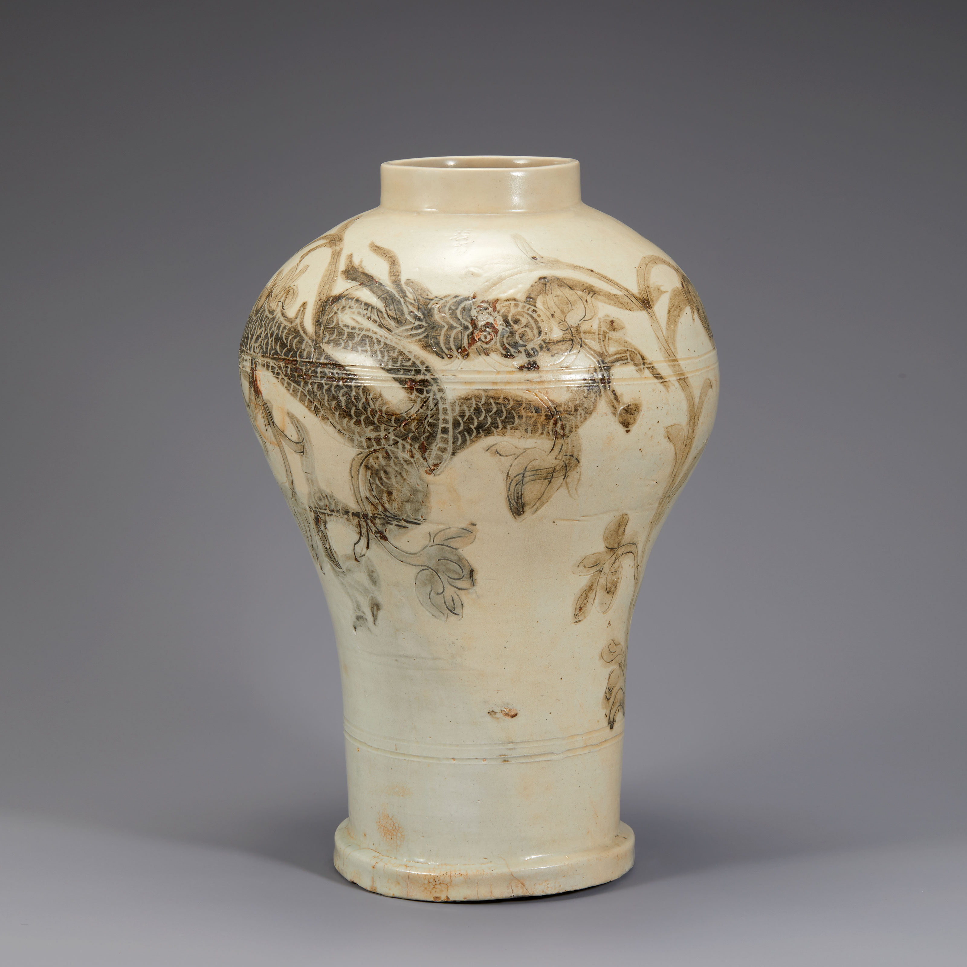 본문 Lot. 34 백자음각철화용화문호 47 x 13 x 20.5cm 조선 전기 상품 상세설명 장신의 호(壺)로 동체전면에 음각으로 용문양과 모란과 같은 꽃을 새기고 그 위에 철화로 칠한 특별한 작품입니다.미색을 띄는 초기백자의 하나로 왕실의 의식에 꽃을 꽂는 용도의 호로 추정됩니다.