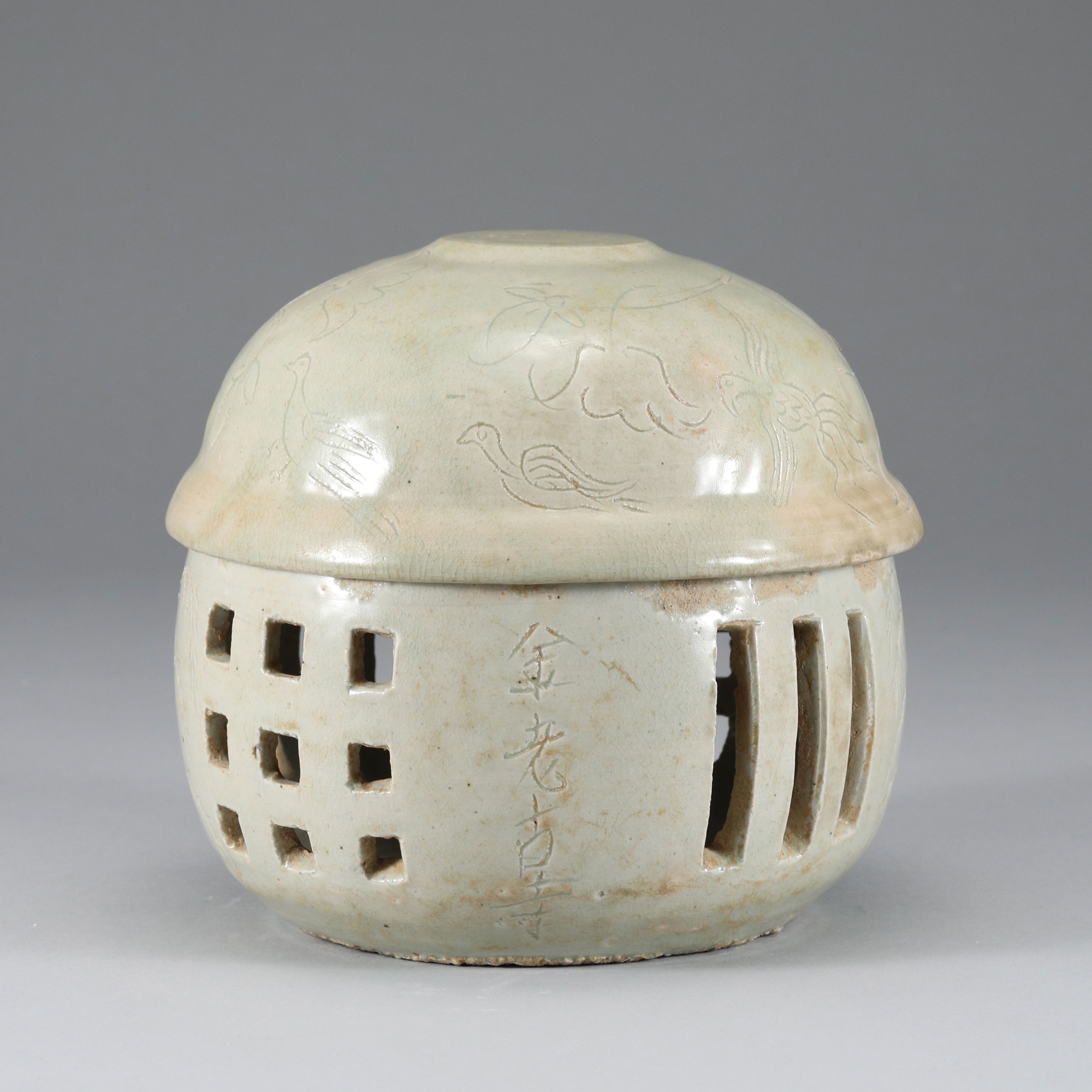 백자음각연화조문투각불감