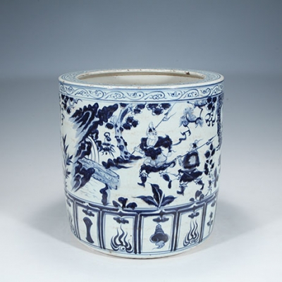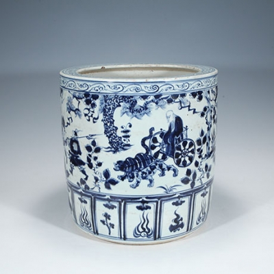 원나라 황실에서 사용되었던 지통으로 청화로 "귀곡자하산도"가 전면에 시문되어 있습니다. 귀곡자는 춘추전국시대의 인물로 전해오며 지통에 제자인 손빈이 연나라에 붙잡혔다는 이야기를 듣고 표범과 호랑이가 끄는 마차를 타고 산을 내려가는 귀곡자의 모습이 그려져 있습니다.